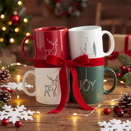 Showcase a set of Christmas-themed mugs with a red ribbon, surrounded by Christmas lights and snowflakes. The mugs should have a sleek, modern design.