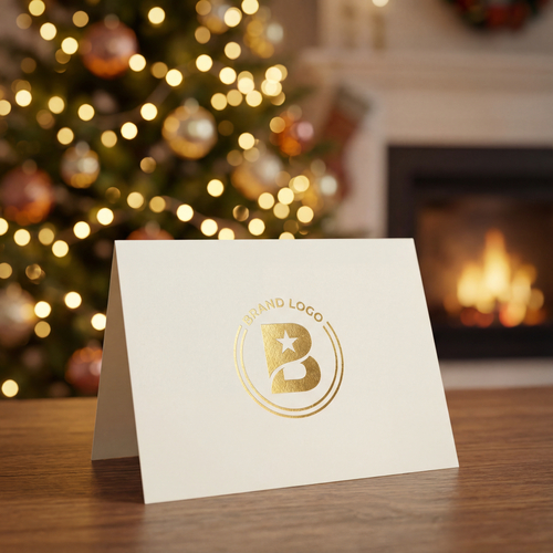 A holiday card design featuring your brand’s logo, set in front of a glowing Christmas tree with soft golden lights, creating a warm and inviting feel.