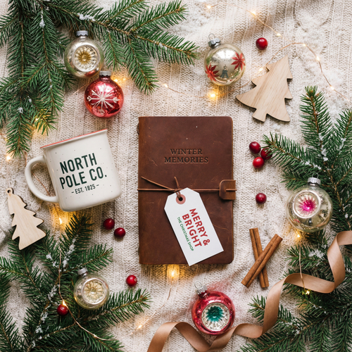 Create a Christmas-themed image for Instagram: A festive flat-lay of Christmas ornaments, pine branches, and branded items, with soft lighting and a snowy effect.