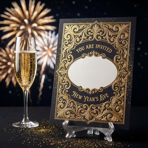 Prompt Example: A person in a velvet gown, holding a champagne flute, in front of a glowing New Year’s Eve city skyline with sparkling lights.