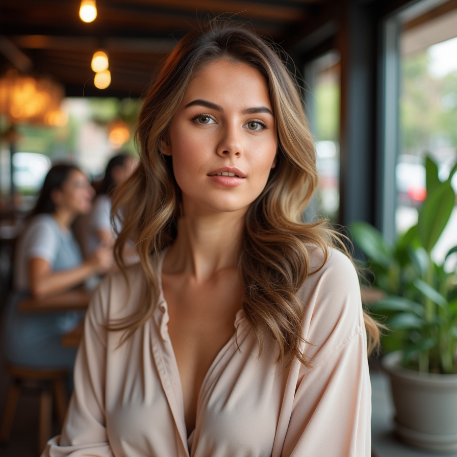 woman radiating confidence and charm. She is dressed in a stylish blouse or dress, with natural makeup and soft curls. The background is a softly lit café or a scenic outdoor setting. Her expression is inviting and cheerful, perfect for a dating profile