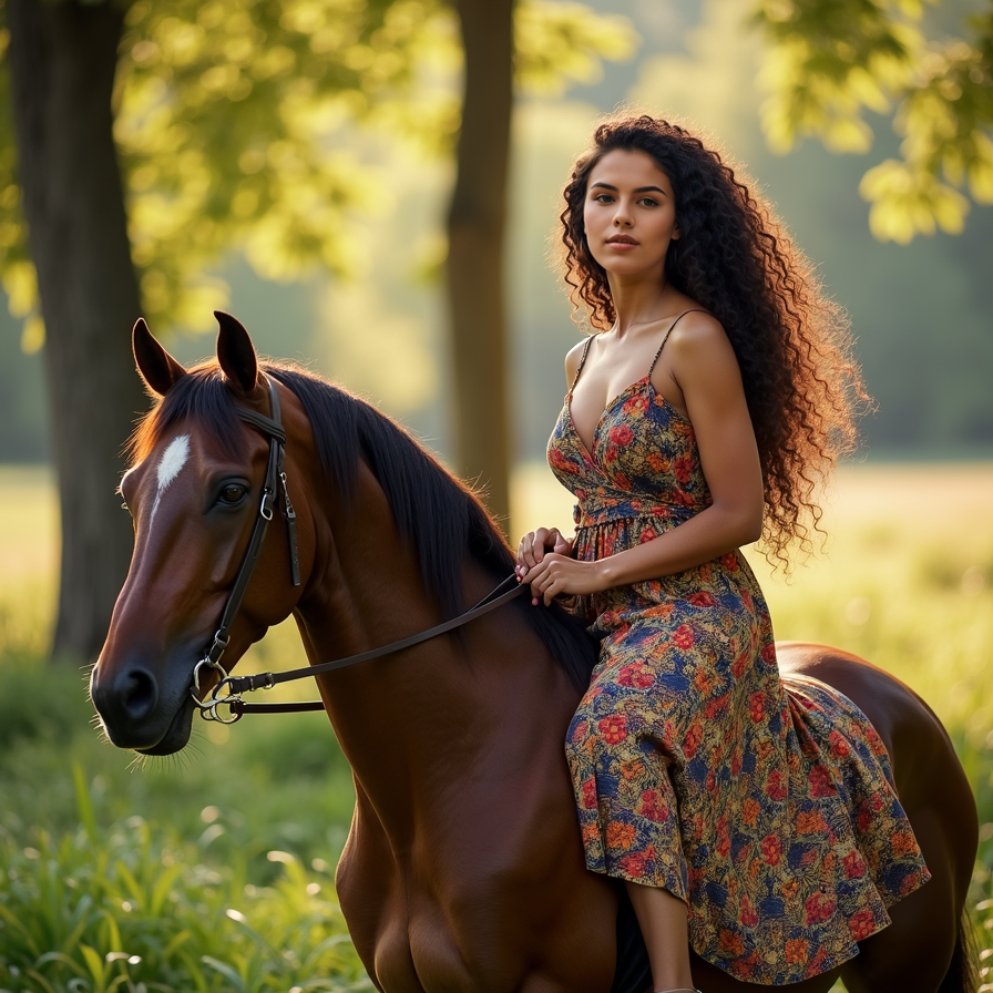 woman in elegant riding attire, long curly hair flowing in the wind, sitting confidently on a majestic horse, set against a serene countryside or rustic farm background with warm sunlight filtering through the trees.