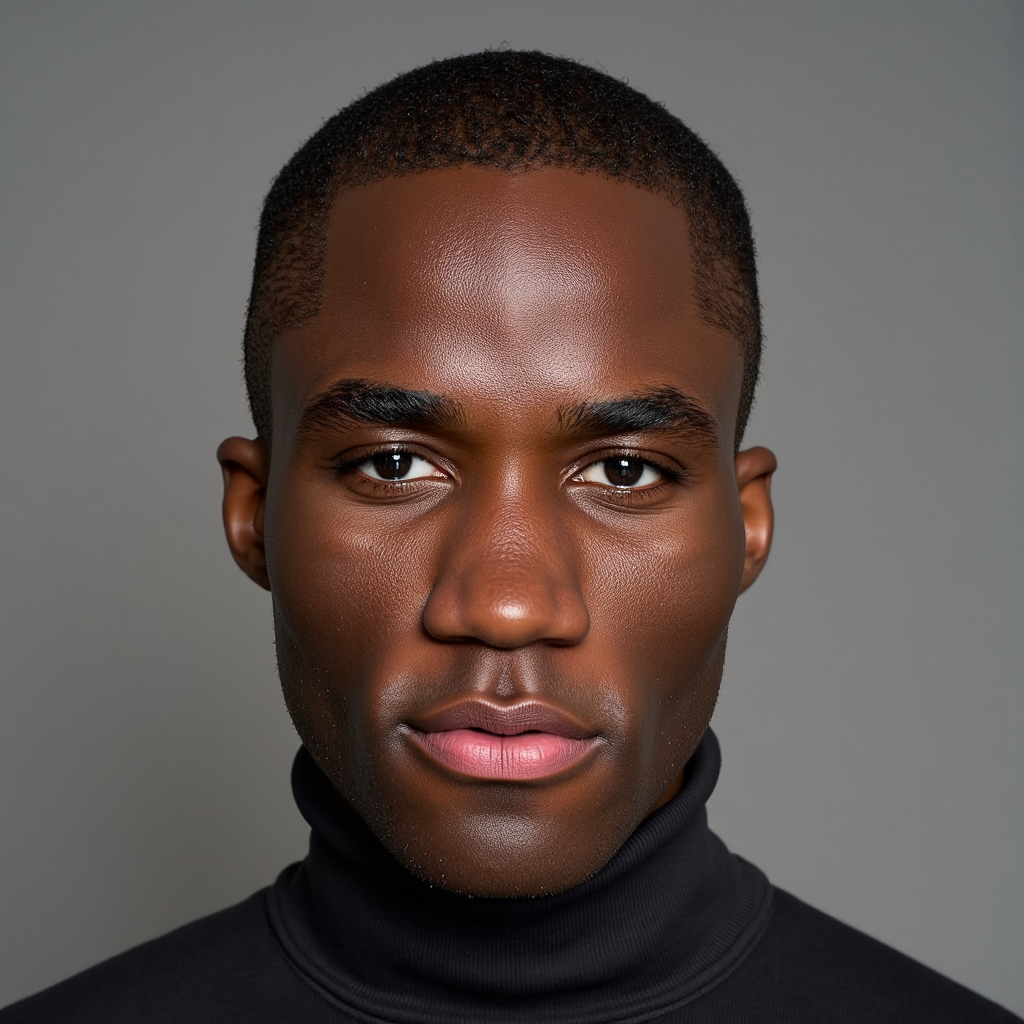 Front-facing close-up of a man wearing a black turtleneck. Clean-shaven, sharp jawline, subtle forehead lines visible. Background: solid muted grey. Even studio lighting creates balanced highlights across cheekbones and nose bridge. Hair texture and skin pores rendered naturally.