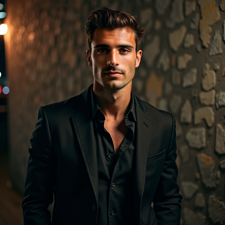 man with a confident, subtle smile. He is styled in dark, sleek clothing, with dramatic lighting highlighting his features. The background is moody, like a dimly lit urban street or an abstract textured wall, evoking intrigue and allure