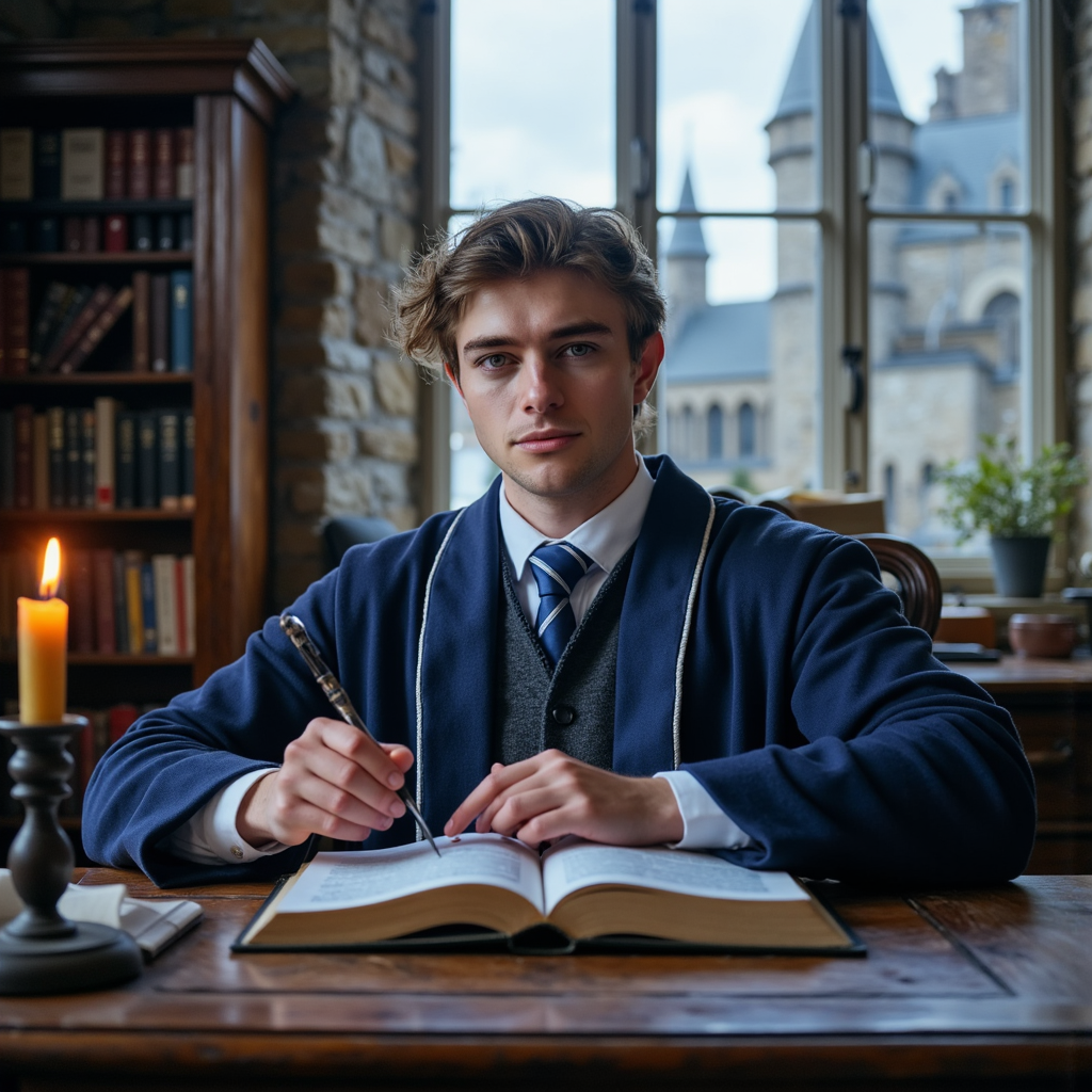 Ultra-detailed HDR seated portrait of a 17-year-old male Hogwarts student with light olive skin, clean-shaven face, and sharp cheekbones. Sleek dark hair pulled back into a short ponytail, neat sideburns framing ears. Wearing a deep-navy wool robe with silver-blue trim, crisp white cotton shirt, and perfectly knotted blue-striped tie. Pose: seated upright at a carved oak desk, left hand resting on an open…