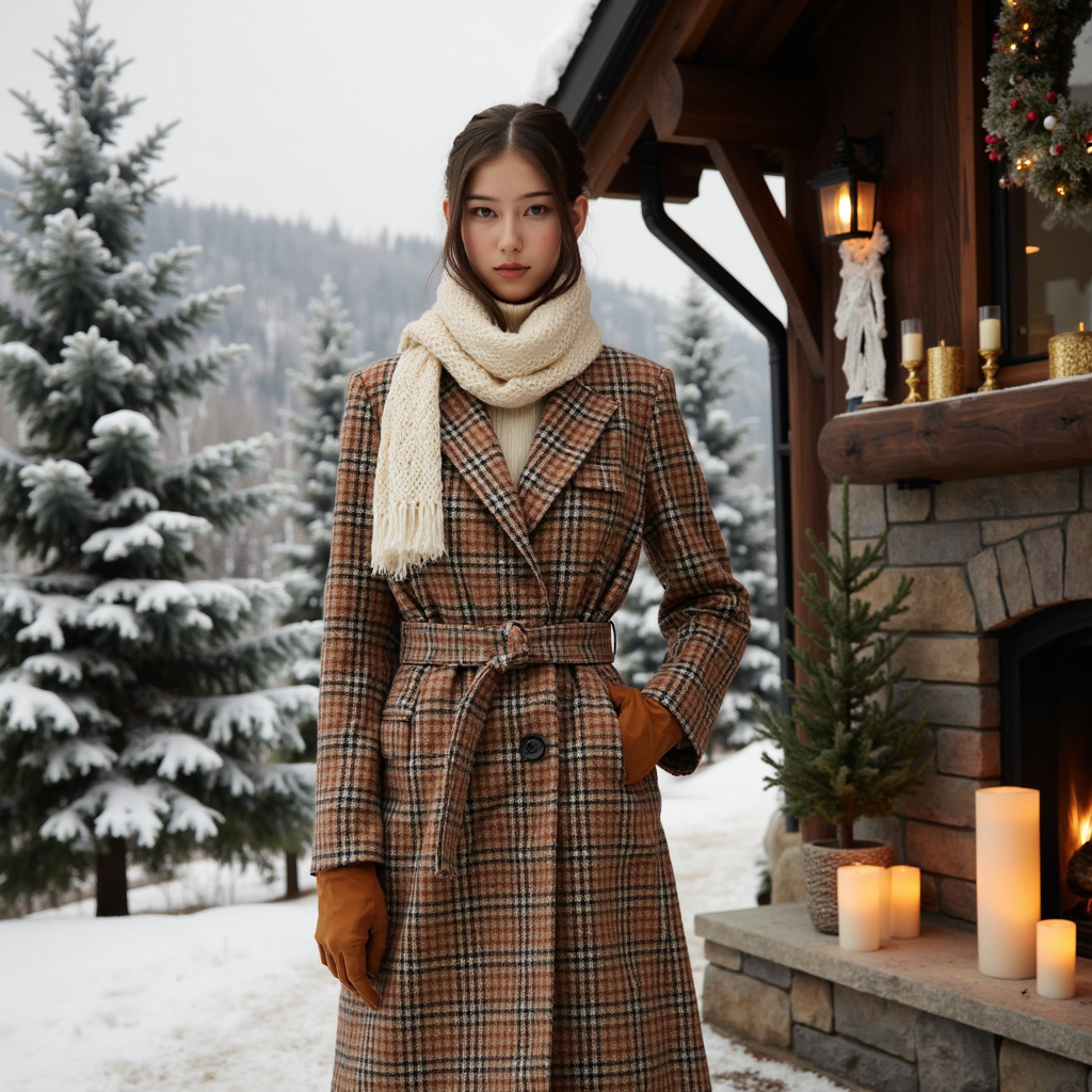 Woman standing on a snow-covered path lined with evergreens, soft overcast sky. Hairstyle: loose braid falling over shoulder, gentle wisps framing face. Attire: wool plaid wrap coat belted at waist, cream knit scarf, suede gloves. Fabric details: plaid pattern visible with soft wool grain, scarf texture defined, suede nap visible. Camera: eye-level, 50mm, f/2.2. Lighting: natural diffused daylight, cool tones with…