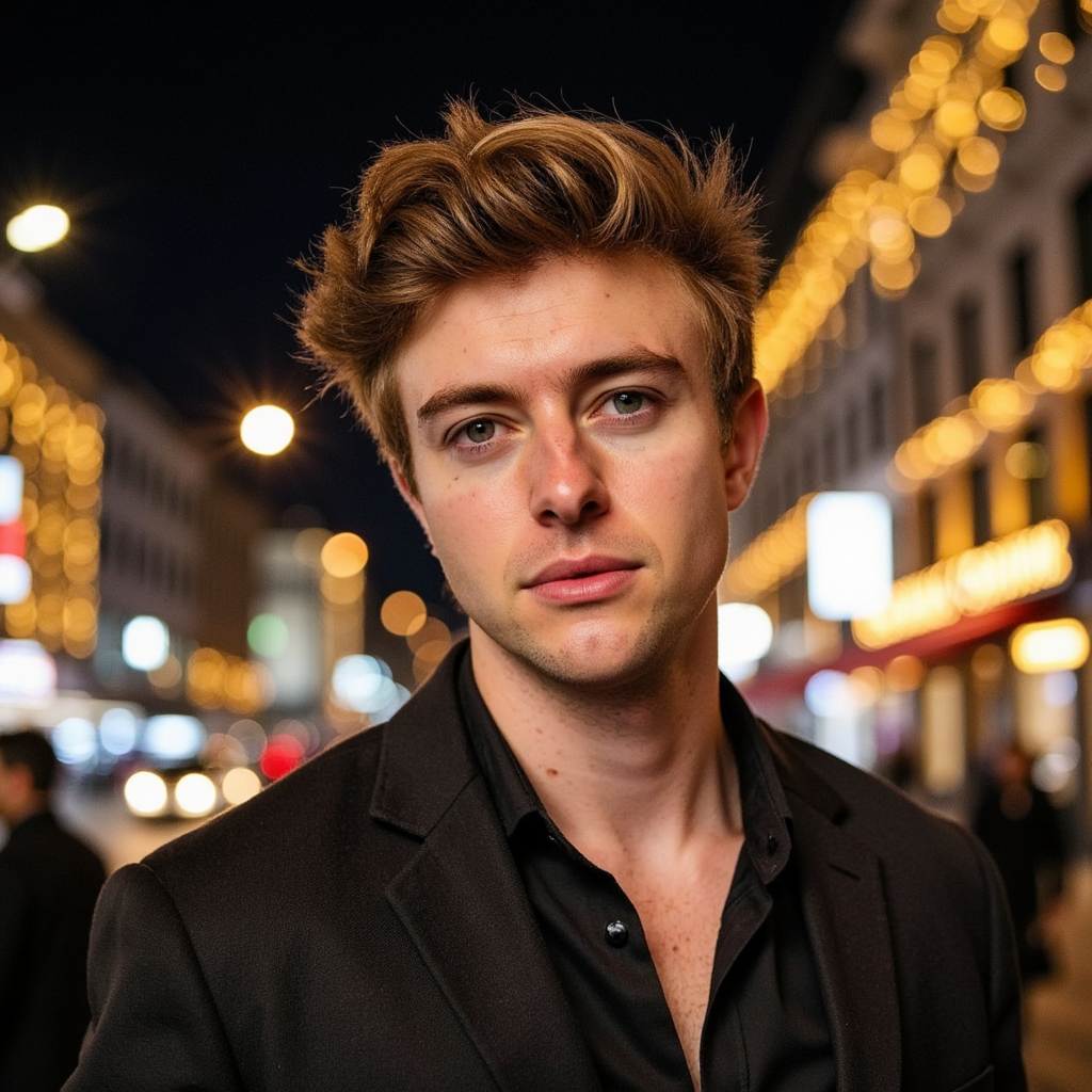 Highly detailed, highly realistic waist-up lifestyle portrait of a man, aspirational New Year night energy, relaxed confident posture. Contemporary evening outfit with visible stitching and fabric grain. Hair styled naturally. Warm ambient lighting from celebration lights around, subtle highlights on face. Background features distant city glow and soft celebratory illumination. Camera slightly angled for dynamic…