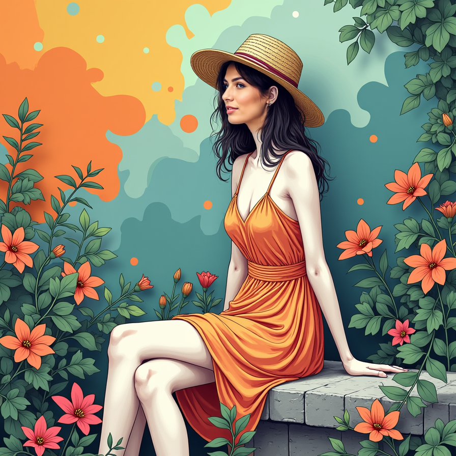 girl in a flowy sundress, sitting on a stone bench, surrounded by lush greenery and vibrant flowers, basking in the warm sunlight in a serene garden setting.