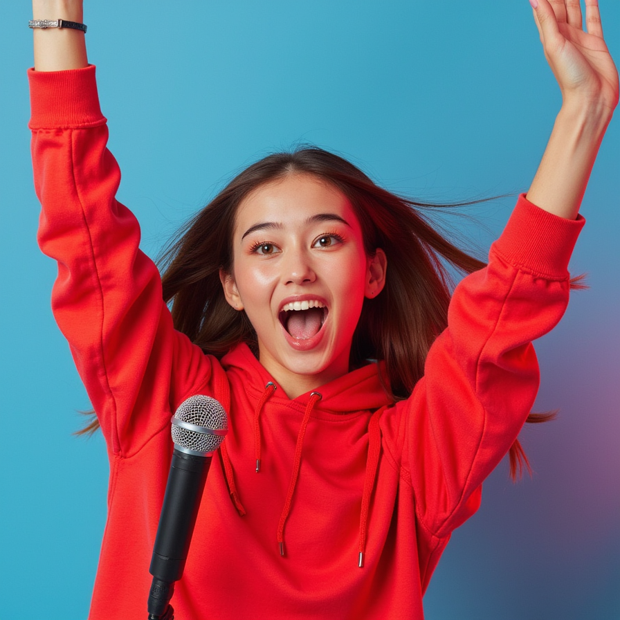 A female content creator mid-20s, tight waist-up, positioned slightly left, wide-eyed excitement, mouth open in a big smile, hands thrown up in a celebratory pose. Facial details: radiant skin, defined eyes with sharp catchlights, soft lip gloss. Outfit: bright, bold red hoodie, slight fabric texture visible, smooth fit. Hair: long, wavy hair with volume, flying slightly as if caught in movement. Pose: arms up, head…