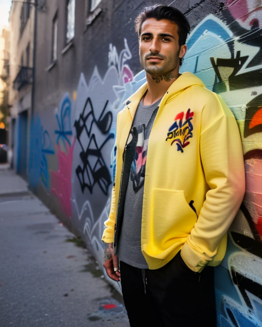 Handsome street punk, graffiti alley, detailed, hyper-realistic setting.