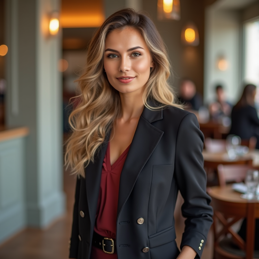woman styled in a classy dress or blazer, with her hair neatly styled and subtle makeup. The background is an upscale indoor setting or softly blurred cityscape. Her expression is poised and confident, reflecting elegance and allure
