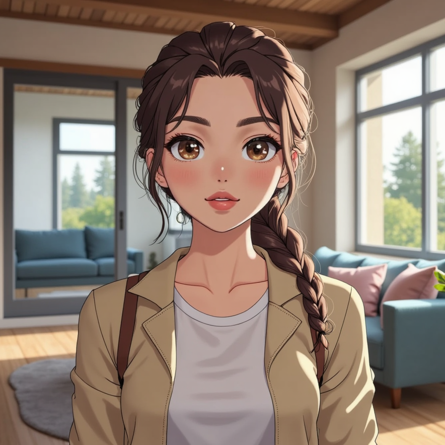 woman with a bright smile and subtle makeup, wearing a trendy outfit and accessories, posing for a selfie with a smartphone in a well-lit, modern room with a blurred background, capturing her confidence and playfulness.