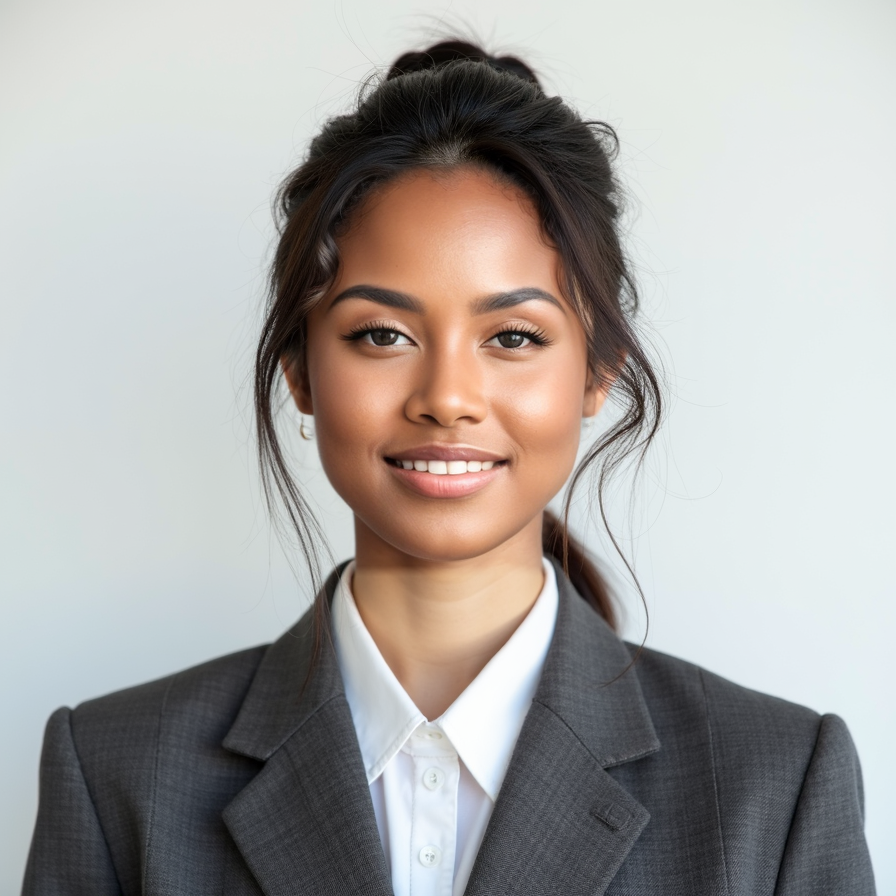 A passport-size photo of a person wearing traditional formal attire, with a neutral expression. The background is plain white, even lighting is used to eliminate shadows. The person is centered and looking directly at the camera