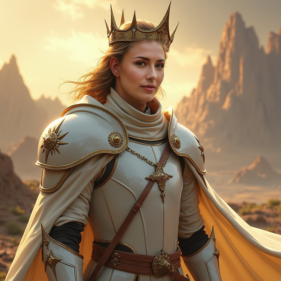 Female paladin, white armor, detailed, magical backdrop.