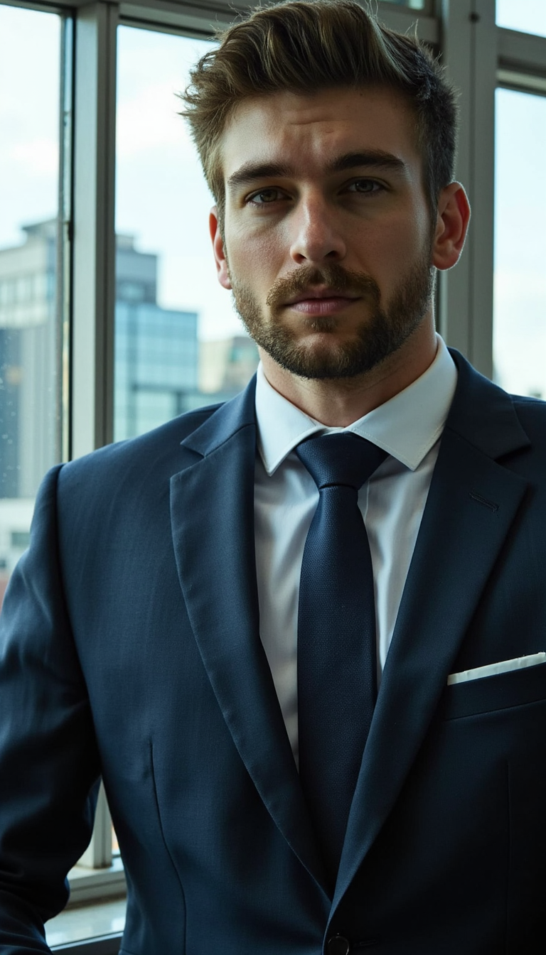 lose-up of a man in a navy suit, seated by a large window in a modern high-rise office, natural daylight hitting one side of his face, clean shave, calm and focused expression, background blur of a city skyline, cinematic tone, ultra-realistic, 16:9