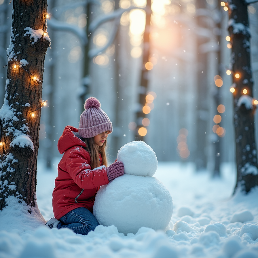 child in warm winter attire, building a snowman amidst frost-tipped trees, surrounded by glittering snowflakes, under a pale blue sky, twinkling fairy lights strung along the trees in a serene, snow-covered forest.