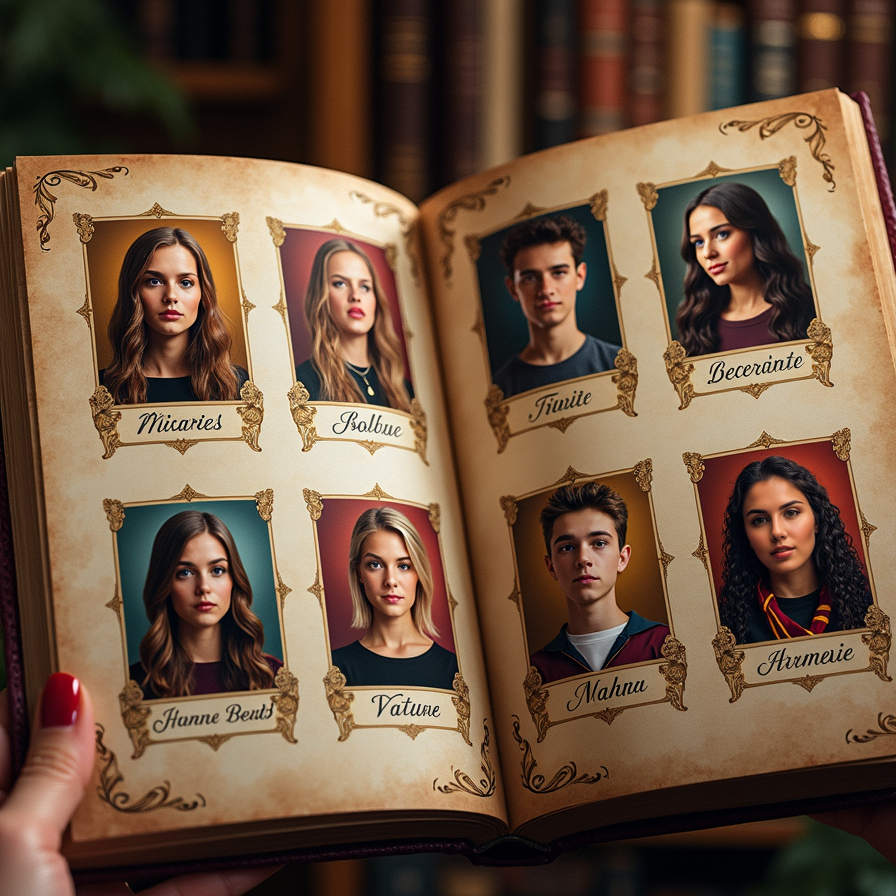 A Hogwarts-style yearbook page featuring student portraits in magical frames, each with a glowing border. Add whimsical details like small moving icons (e.g., animated owls, wands, or potion bottles) and house names written in elegant, enchanted lettering