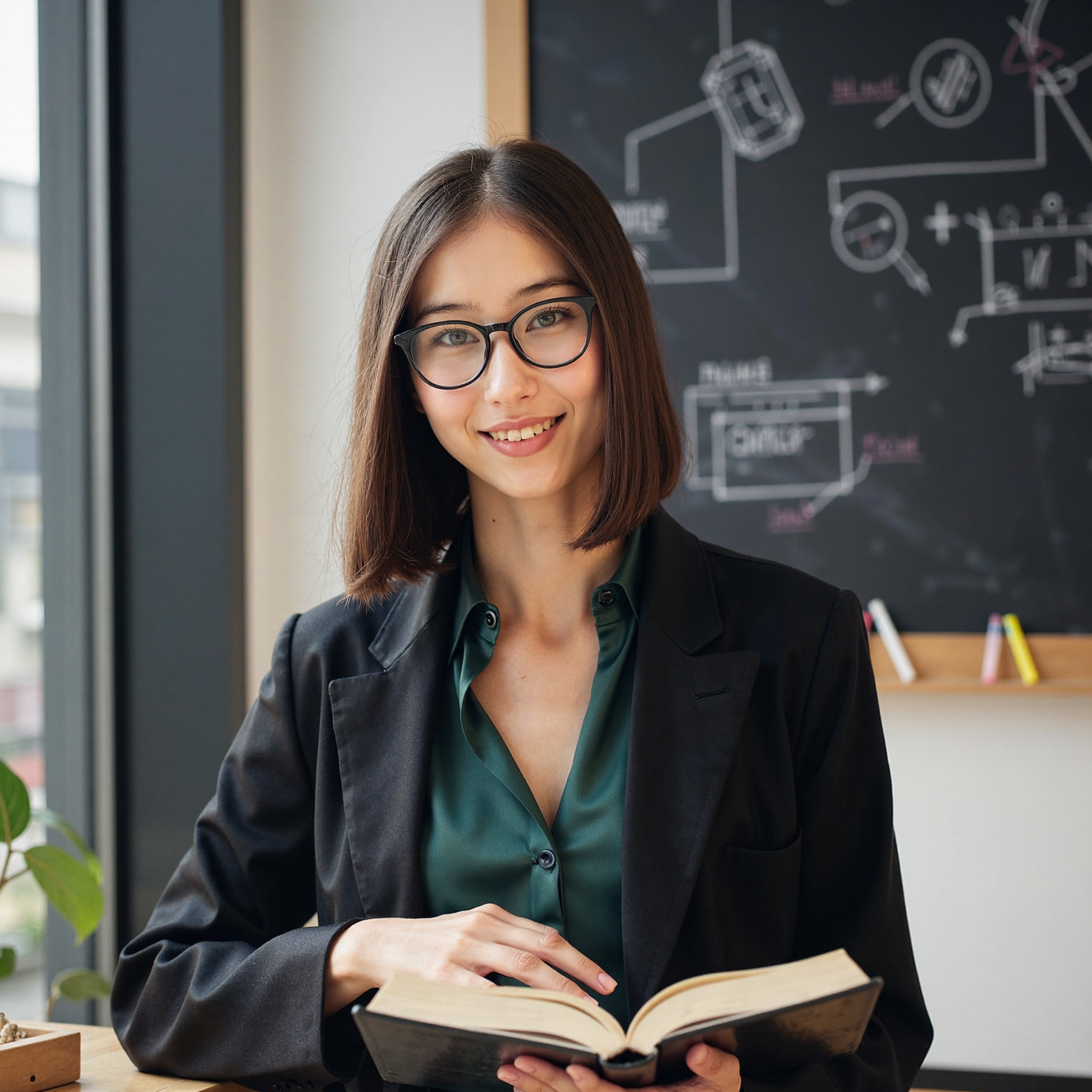 Highly realistic HDR portrait of a woman professor with salt-and-pepper bob hairstyle; dark wool blazer over a jewel-tone silk blouse; fine-rimmed glasses. Camera: 85mm lens, f/2.0, ISO 250, chest-up, shot from slightly below eye level for authority. Lighting: natural window daylight as key, subtle fill from white wall; shadow defines cheekbones and jawline. Pose: holding an open book at chest height, warm attentive smile. Background: blurred chalkboard with neat diagrams and a few colorful markers, minimal clutter.