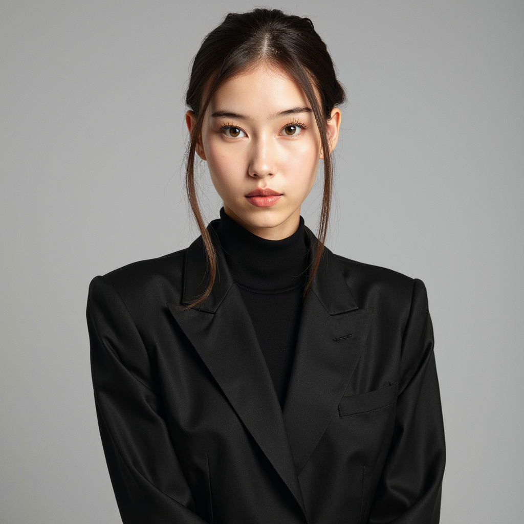 A highly realistic passport photo of a young woman, framed in a waist-up shot. She wears a tailored black blazer with a high-collared blouse, emphasizing a clean, polished look. Her hair is styled in a simple, neat updo, with a few loose strands framing her face. The lighting is soft and even, with a slight light falloff at the edges to create depth. The background is a soft gray with a minimal blur, ensuring the subject remains the focal point. The image is captured at eye level, with the camera slightly to the left, capturing her from a slight angle while maintaining a neutral, professional expression. The fabric of her blouse and jacket are highly detailed, with subtle texture visible. The shot is HDR for perfect clarity, showcasing her detailed features and clothing.dil