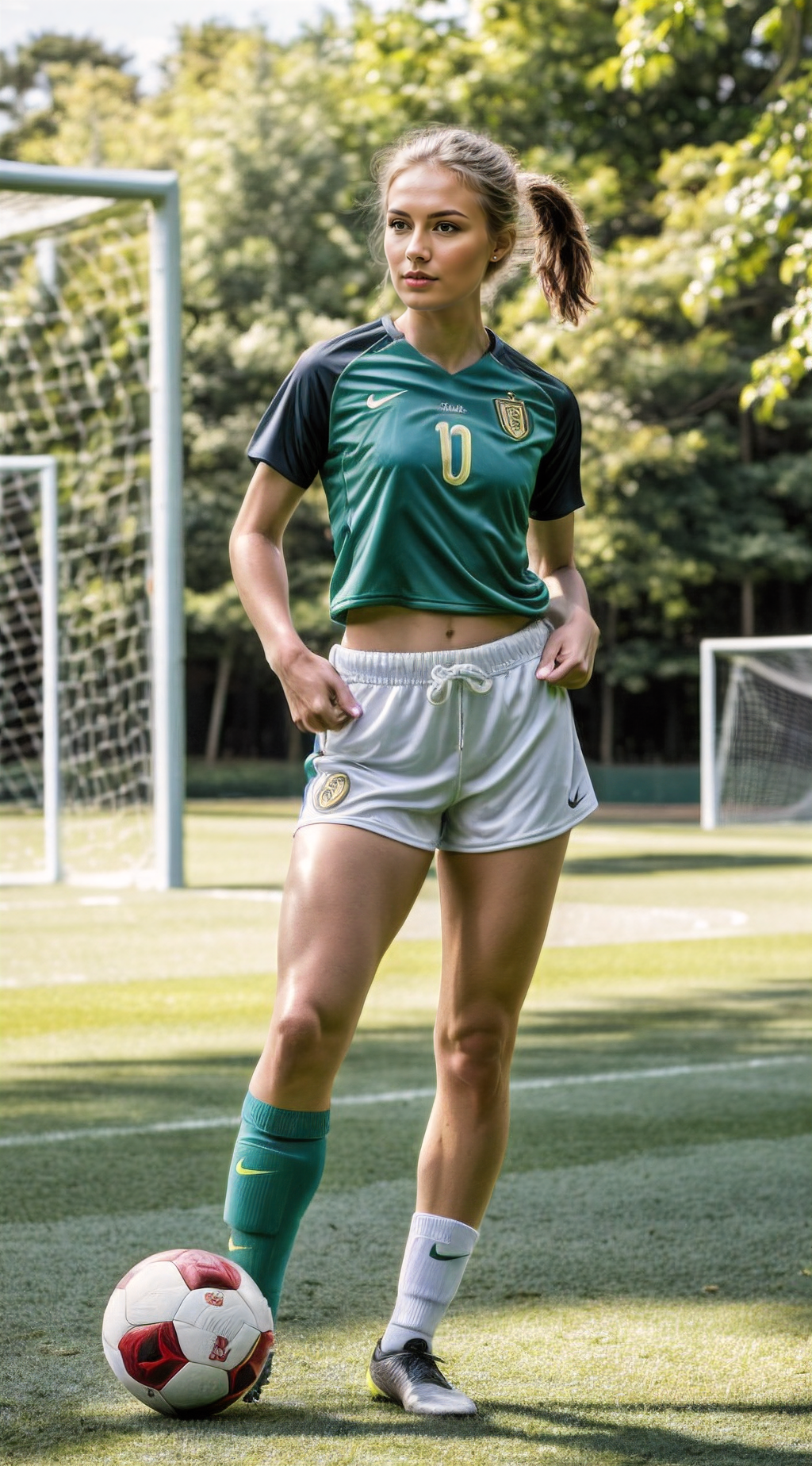 Athletic woman playing soccer, dynamic pose, sunlit field.