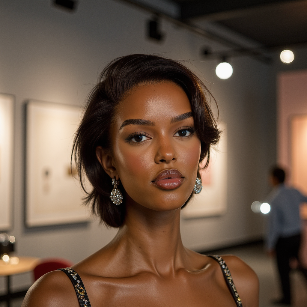 woman in an elegant, contemporary look, photographed in a scene that celebrates visual storytelling and creative expression. A vintage camera is placed as a creative prop. The background is softly blurred with gallery-inspired elements and artistic lighting accents. Studio lighting enhances her facial features with sculpted shadows and soft gradients. Her expression radiates quiet confidence and artistic energy.…