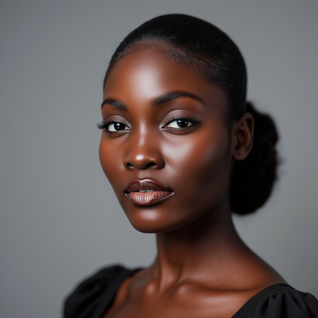 Woman in dark outfit, minimalist backdrop, professional, confident.