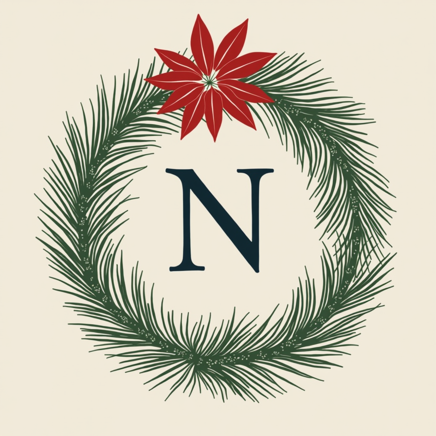 A minimalist art print against a neutral background, displaying a monogram or emblem entwined with subtle holiday greenery—perhaps pine needles or a single poinsettia bloom—resulting in a refined, personal décor piece