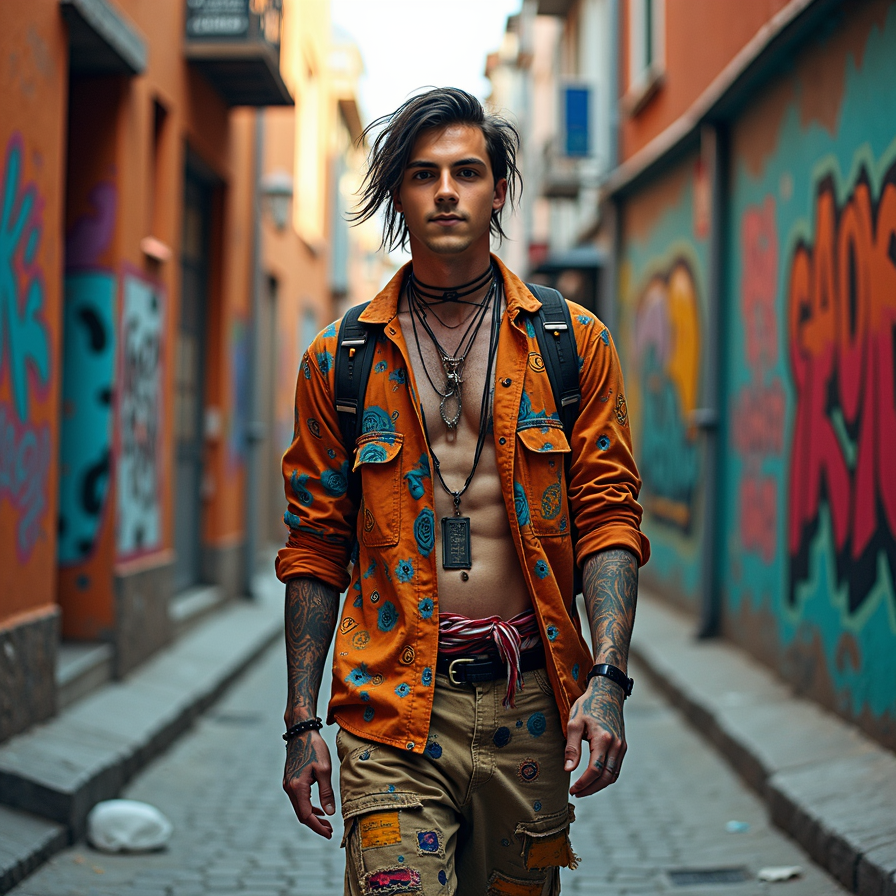 man in vibrant, eclectic dress with bold patterns and bright colors, confidently walking down a lively street lined with bright street art, surrounded by urban chic architecture, under the warm glow of natural light.