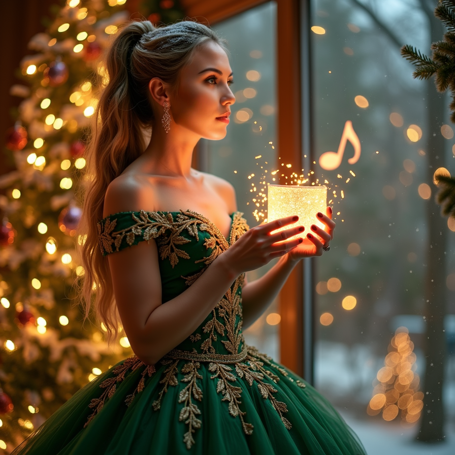 A woman in an elegant emerald-green ballgown adorned with golden embroidery of holly leaves and berries. She stands in a glowing forest of sparkling Christmas lights, holding a magical gift card that glows with a golden aura. Musical notes float around her as she sings, the gift card shining like a beacon in the soft snowfall that dusts the enchanted landscape.