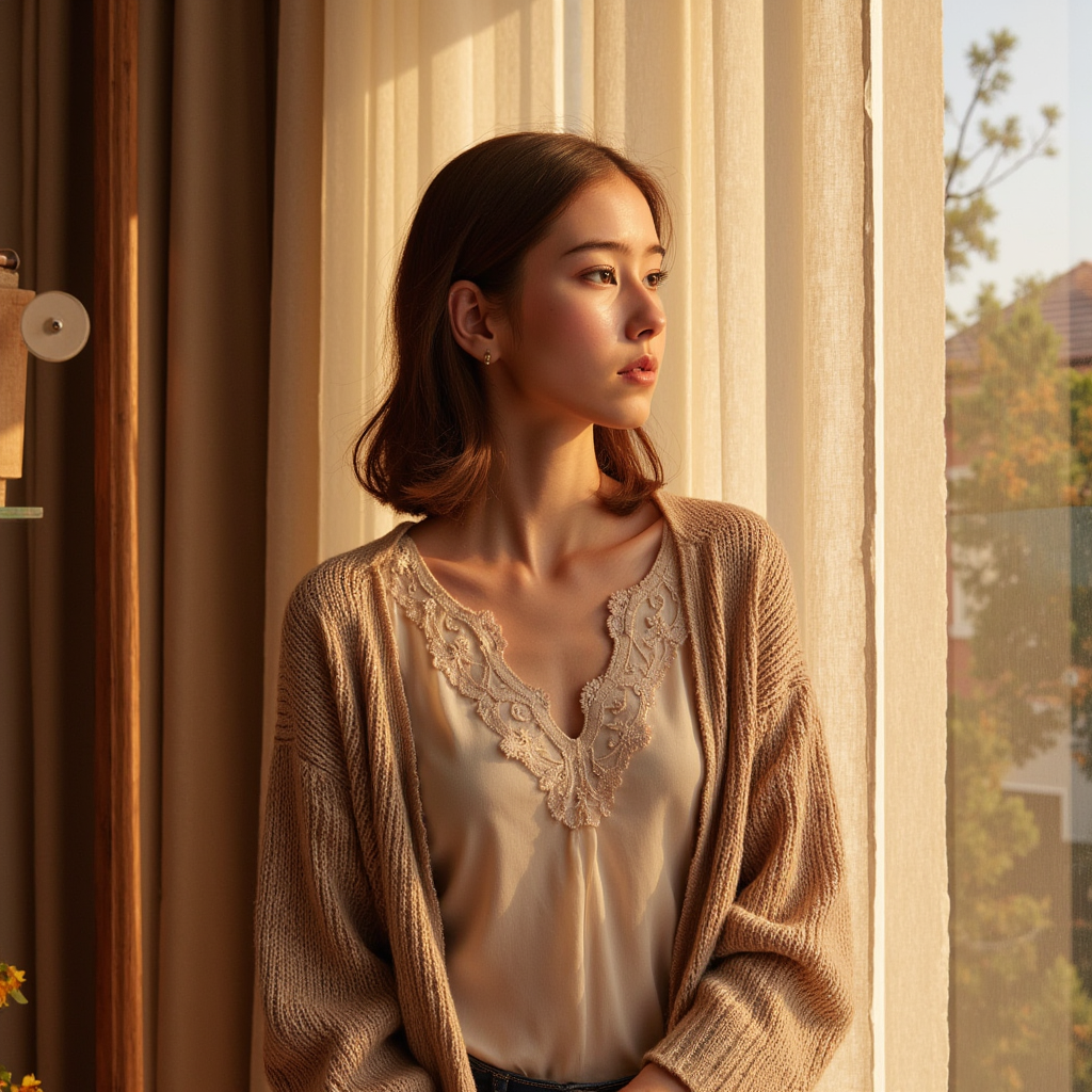 Highly realistic, highly detailed, hyperrealistic HDR portrait of a woman (female, ~32 yrs) standing waist-up beside a tall window as afternoon sunlight streams through sheer curtains. She wears a soft camel-colored knit cardigan layered over an ivory blouse with delicate lace detailing at the neckline. Hair shoulder-length, auburn with subtle waves, tucked behind one ear. Camera positioned slightly from the side…
