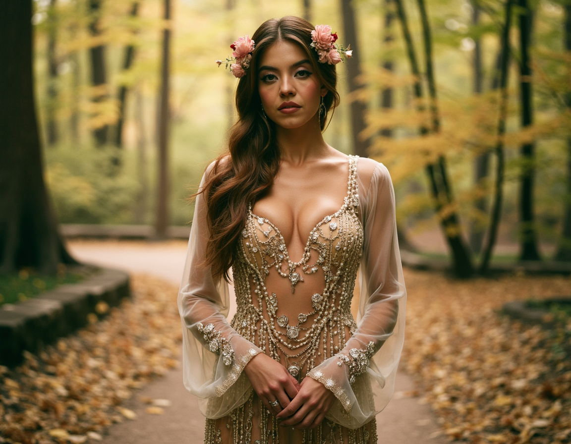 In the foreground, a beautiful woman with flowing chestnut hair and piercing emerald eyes stands gracefully, her long, flowing gown adorned with intricate patterns of vines and flowers. Her hair is adorned with a delicate crown of flowers, and her hands are gently clasped, exuding a sense of calm and wonder. Behind her, a misty, enchanted forest stretches into the distance, with towering ancient trees, glowing…