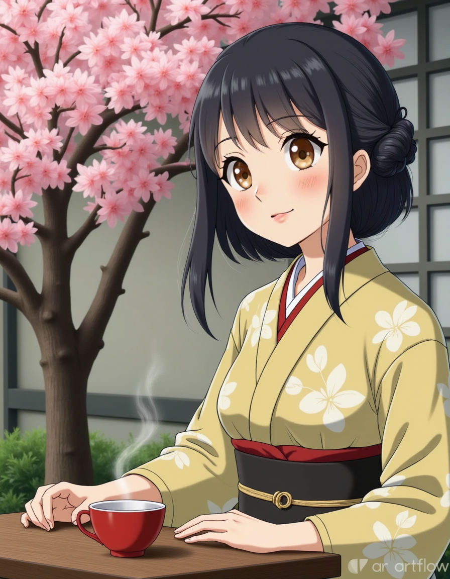 woman wearing traditional kimono, serving japanese tea amidst sakura, animated style image, with soft colours and hand drawn style art inspired from studio ghibli