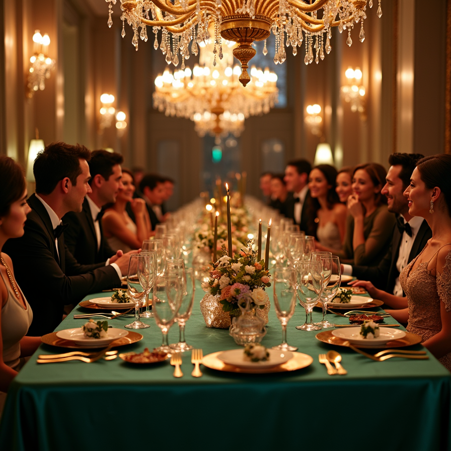 An elegant dining table adorned with metallic accents, deep emerald tablecloths, and gold cutlery. Guests in sophisticated attire are seen chatting and laughing, while chandeliers and candles cast a luxurious glow over the scene.