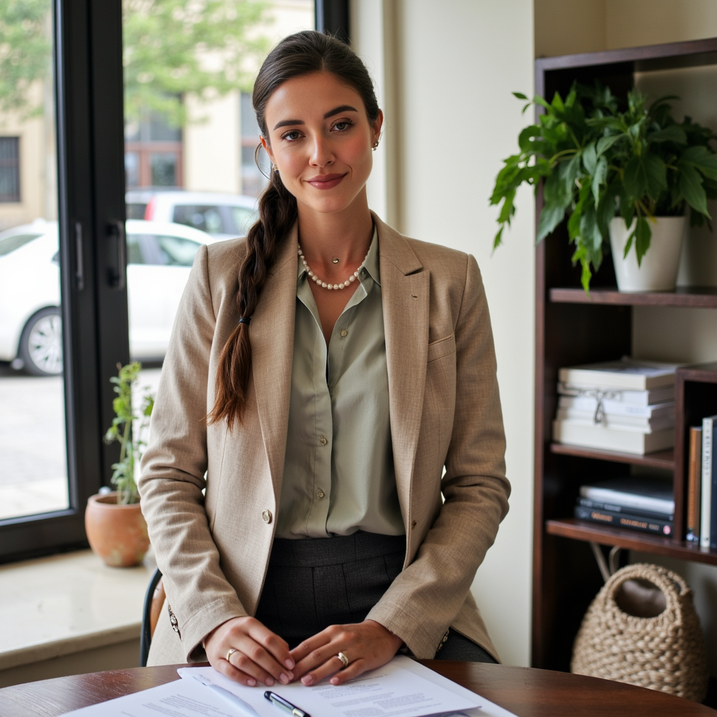 Medium shot, 50 mm f/2.0, natural light. Woman late 30s, fair freckled skin, hair in long braid over one shoulder. Beige linen blazer with notch lapels, pale green silk blouse. Seated at outdoor cafe table with neatly stacked documents, holding a pen. Lighting: open shade with soft wraparound highlights. Background: faint blur of urban street.