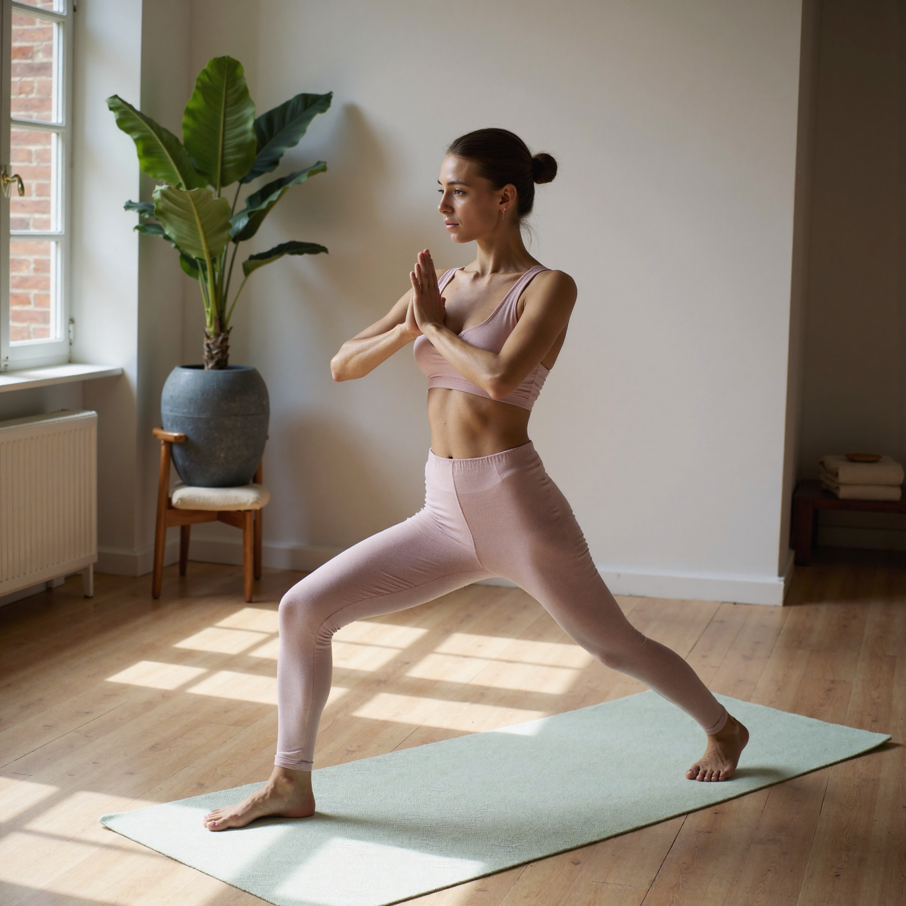 Woman in Warrior II (Virabhadrasana II) on a pale sage mat in a sunlit, minimalist studio; low bun hairstyle, serene expression, eyes over front fingertips; wearing a pastel seamless set (dusty-rose sports bra and leggings with fine rib knit texture), bare feet; camera at chest height, 35mm, f/3.2, 1/200, ISO 400; soft north-window daylight with gentle fill from a white bounce, crisp floor shadows defining geometry;…