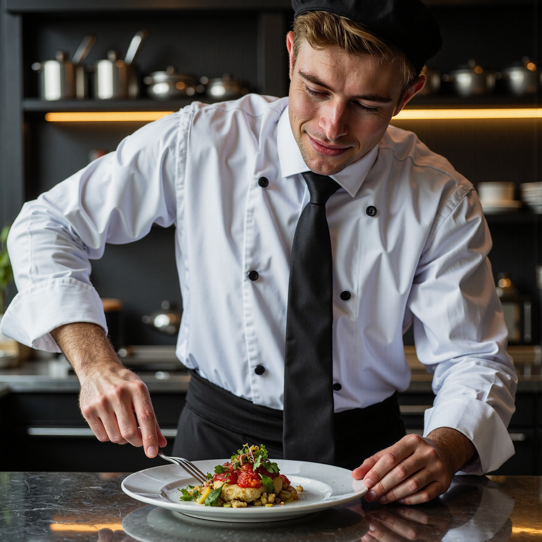 Highly detailed, highly realistic HDR portrait of a man chef in a spotless double-breasted cotton chef jacket with matte black buttons, sleeves neatly rolled; short trimmed beard, hair under black cap. Camera: 50mm lens, f/2.2, ISO 320, shot slightly above eye-level, waist-up angle to emphasize plated dish. Lighting: tungsten kitchen lights with softbox fill from camera left, gentle shadows to right; highlights glint…