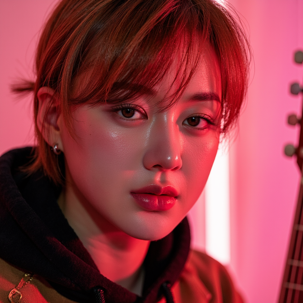Close-up headshot of a singer-songwriter with tousled hair, casual hoodie, faint smile, soft sunset lighting — quiet and personal like Ed Sheeran’s Play tour