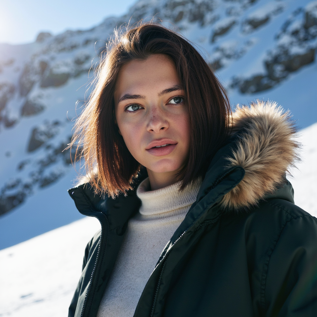 A highly realistic, ultra-detailed HDR waist-up winter portrait of a woman standing near the base of a tall snowy cliff. Camera angle: slightly low, 35mm lens. She wears a dark forest-green parka with a faux-fur hood, the fur holding clusters of detailed snow crystals. Underneath, a cream wool sweater with ribbed texture peeks out. Her dark brown hair is partially tucked into the hood but loose enough to show…