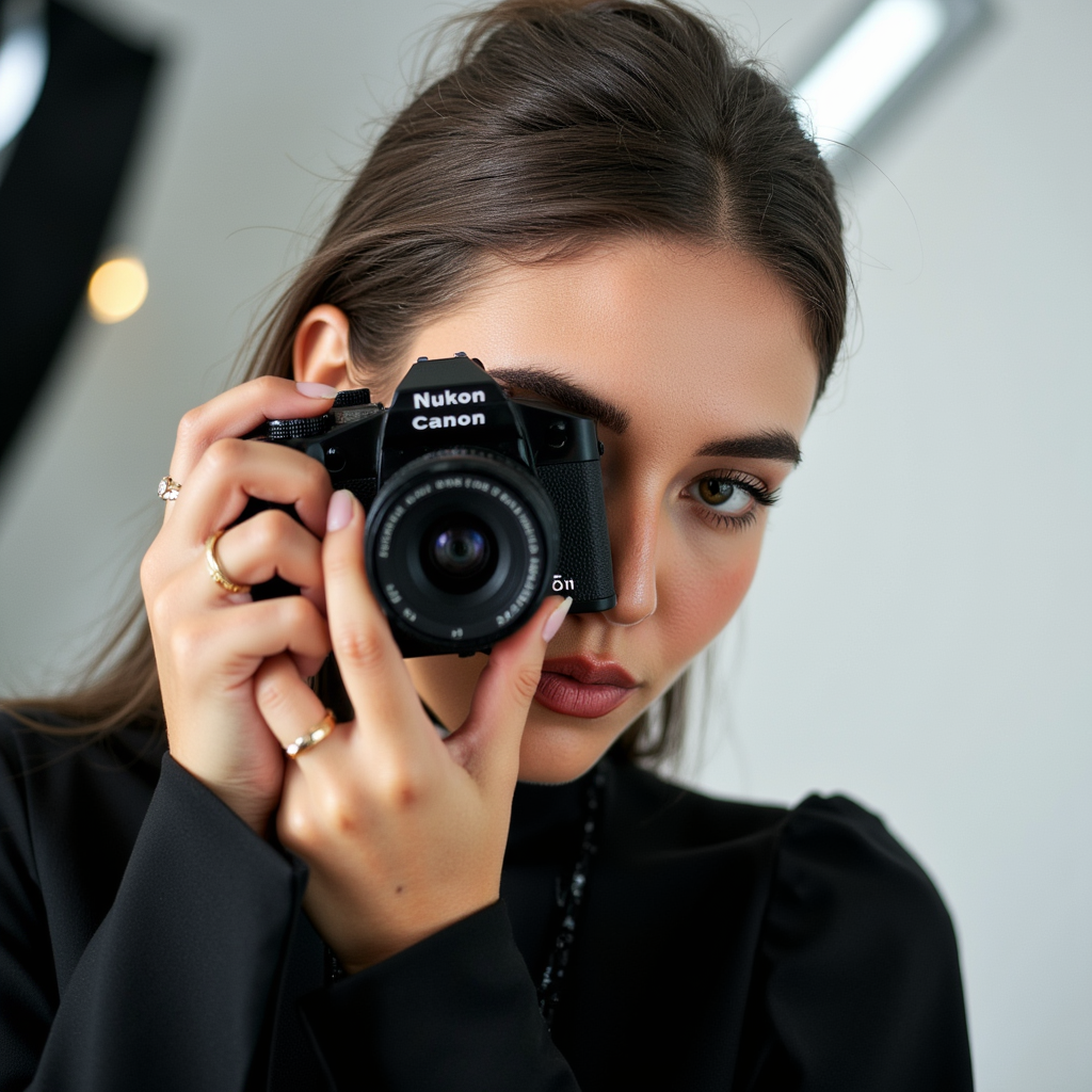 Bold close-up of a female photographer adjusting her lens, eyes focused, monochrome outfit, dramatic lighting setup, honoring World Photography Day creators