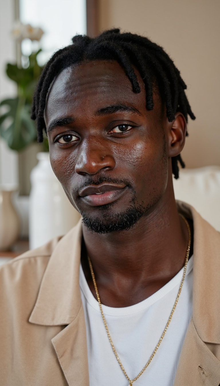A realistic lifestyle portrait of a person in casual clothing on New Year morning, clean interior, soft neutral colors, relaxed posture, minimal props, fresh start mood, ultra-realistic, highly detailed, HDR