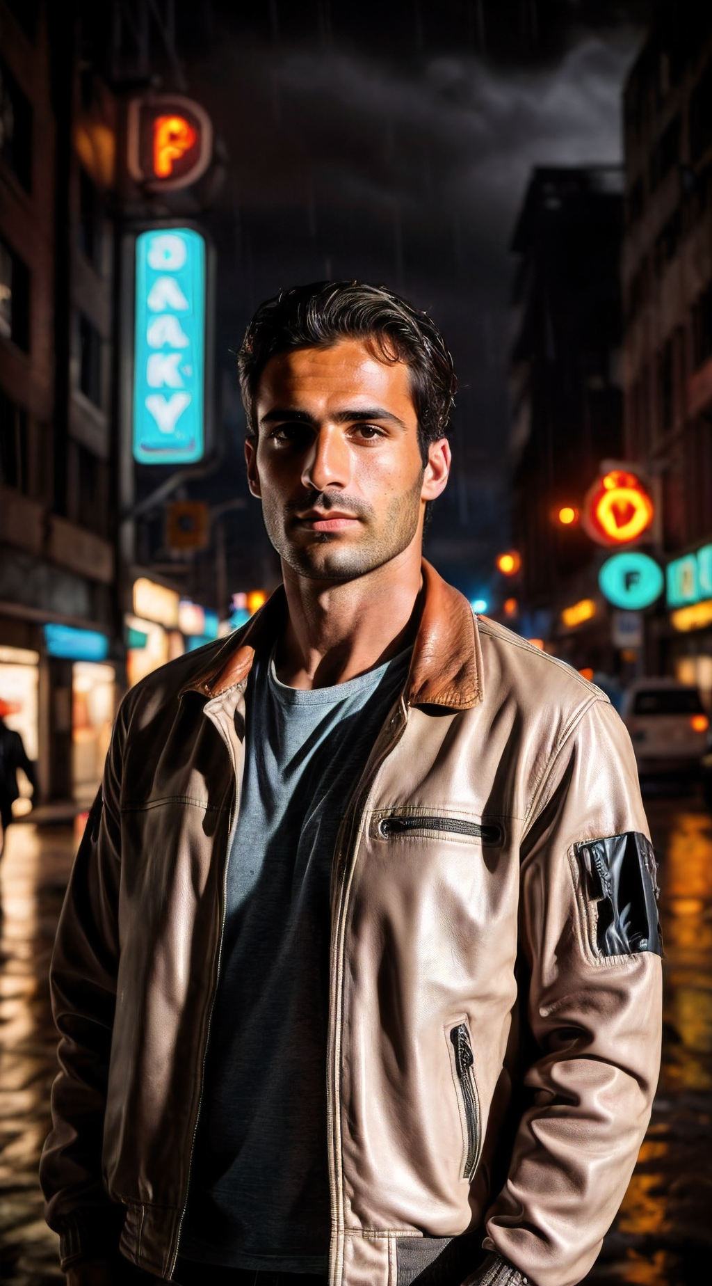 Rugged man, cybernetic implants, neon-lit cyberpunk cityscape, intense gaze.