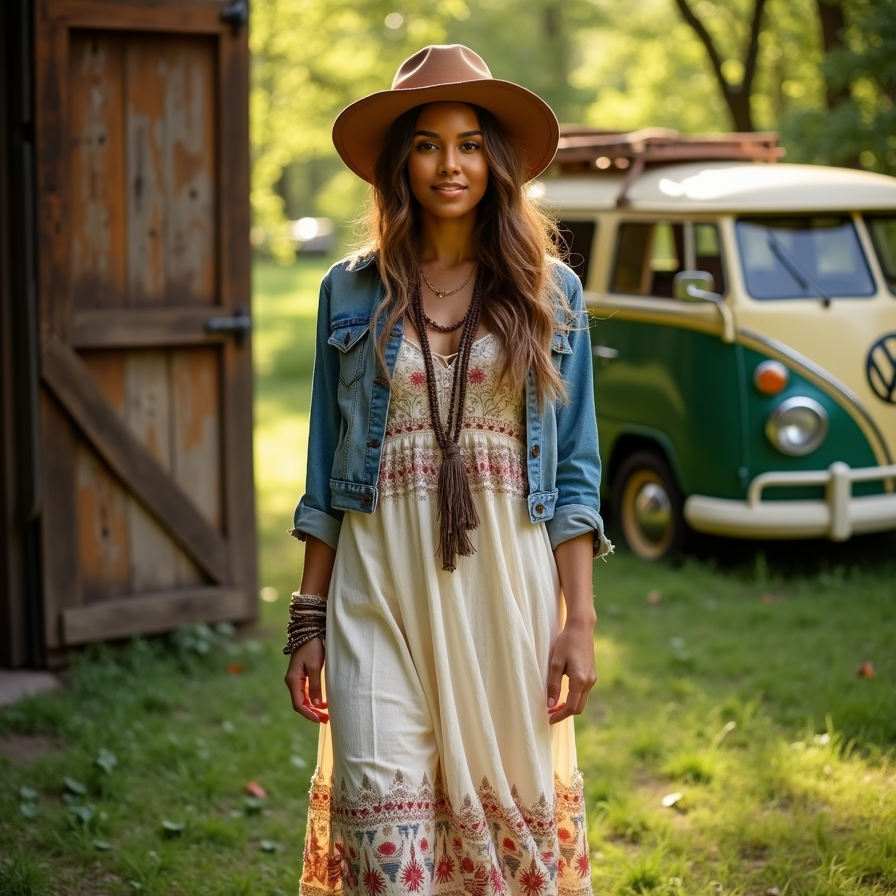 woman in a flowing, bohemian dress with a floppy hat and layered necklaces, standing in a lush, green outdoor setting with a rustic wooden door or a vintage van in the background, warm, golden lighting.