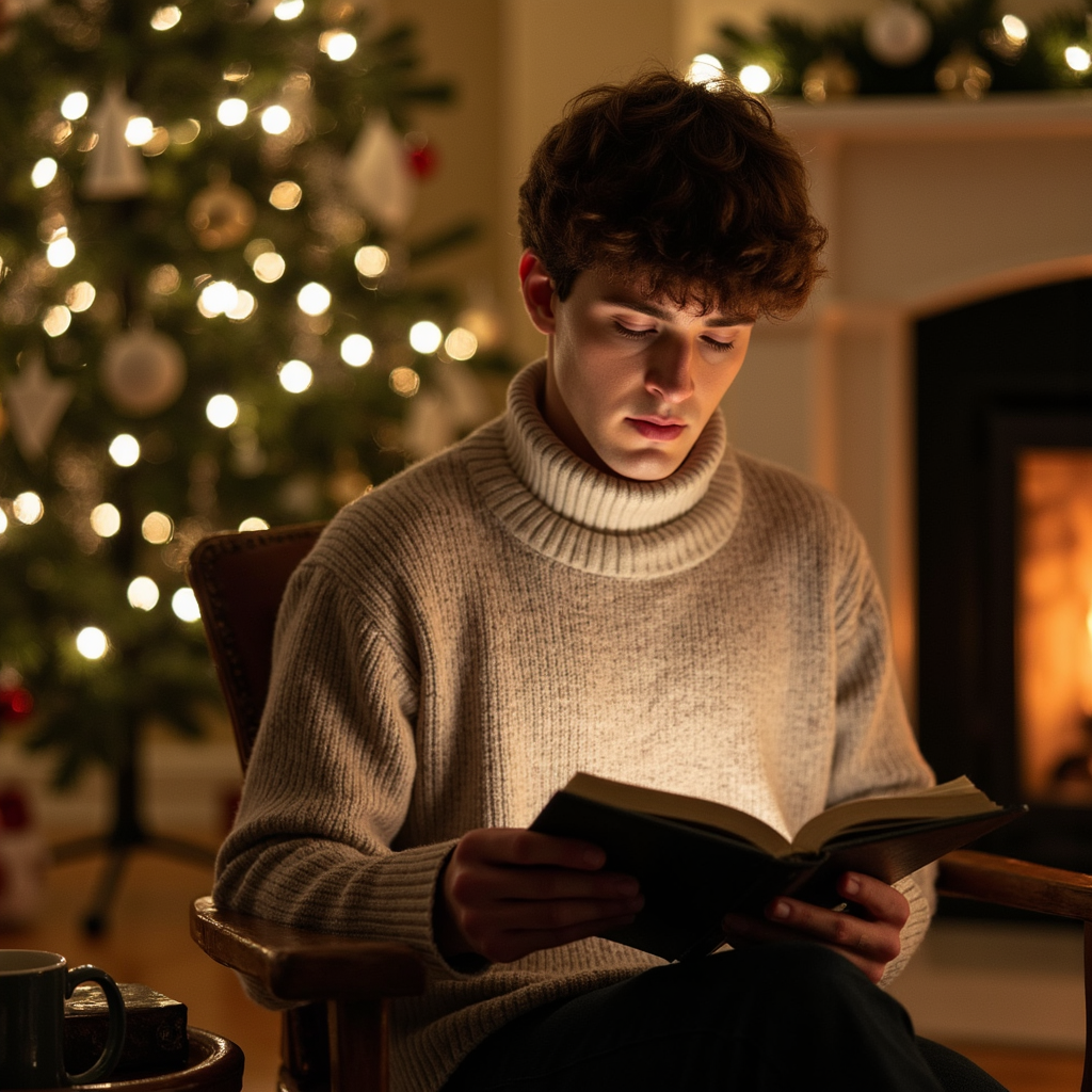 close up of a man in a relaxed turtleneck sweater and comfortable trousers, sitting in an armchair near a fireplace with a decorated christmas tree off to the side. he holds an open book in his lap, looking down at the pages with a calm, absorbed expression. a simple mug of hot drink rests on a small side table next to him. the fireplace casts a warm, directional glow across his face and hands, while the tree lights…