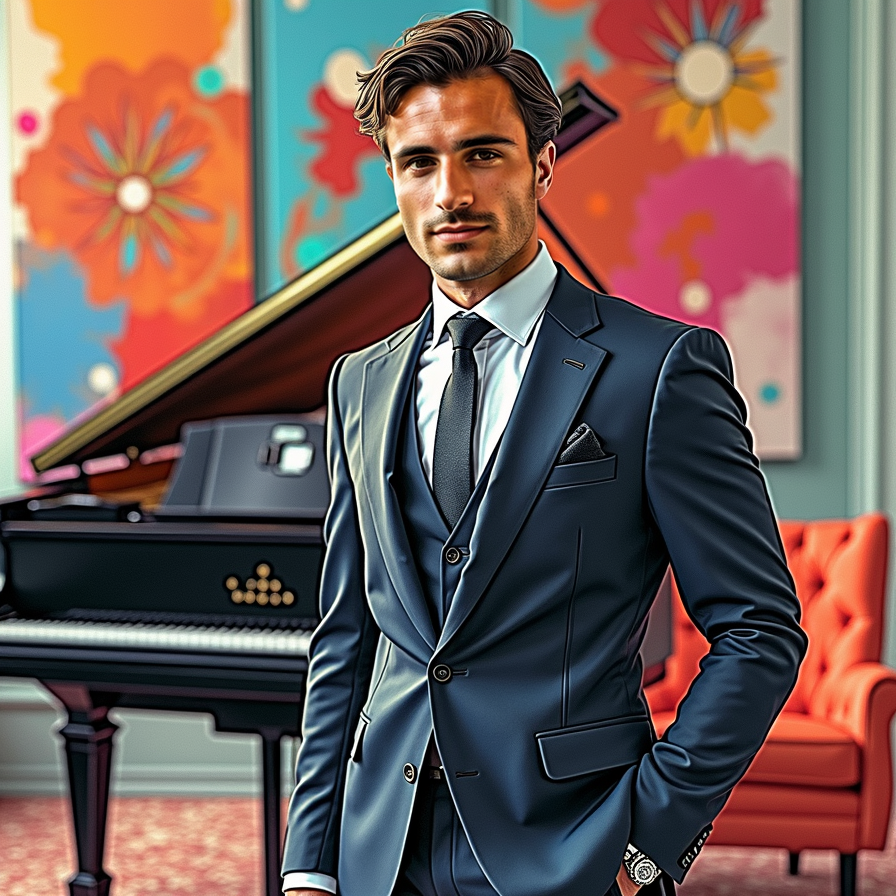 man wearing luxurious suit, surrounded by wealth and opulence, standing in a lavish living room with a grand piano and expensive artwork.