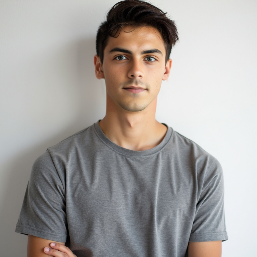 A passport-size photo of a young adult wearing a casual t-shirt, smiling subtly but neutrally. The background is plain white, and the lighting is soft and evenly distributed. The subject is centered, looking straight into the camera