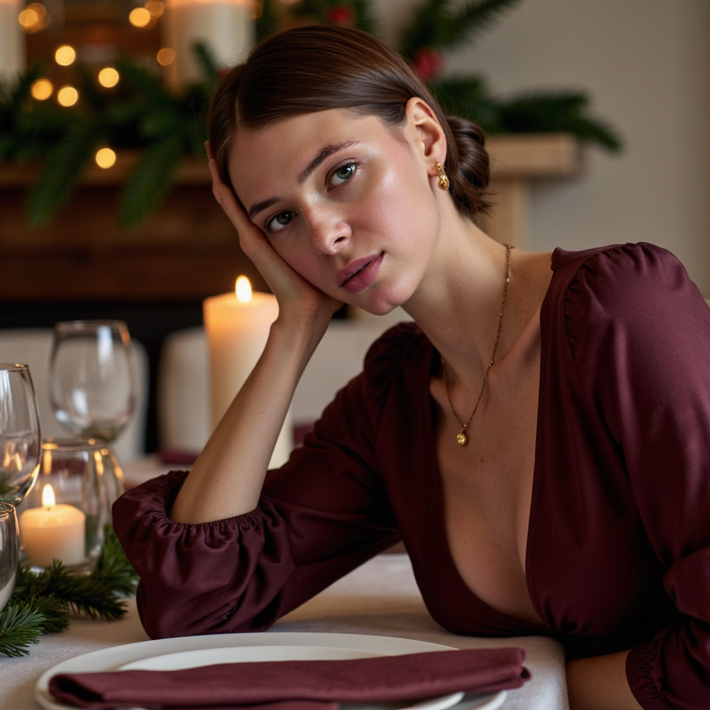 Waist-up portrait of a woman leaning gently on a holiday tablescape, angled 20° left of camera, gaze softly to lens, rule-of-thirds placement. Wardrobe: burgundy satin blouse with subtle sheen and gathered cuffs; a thin gold pendant. Hair: low chignon with face-framing tendrils. Makeup: soft bronze eyeshadow, defined lashes, rosewood gloss. Lighting: candlelight key (multiple small flames) with a dim overhead softbox…