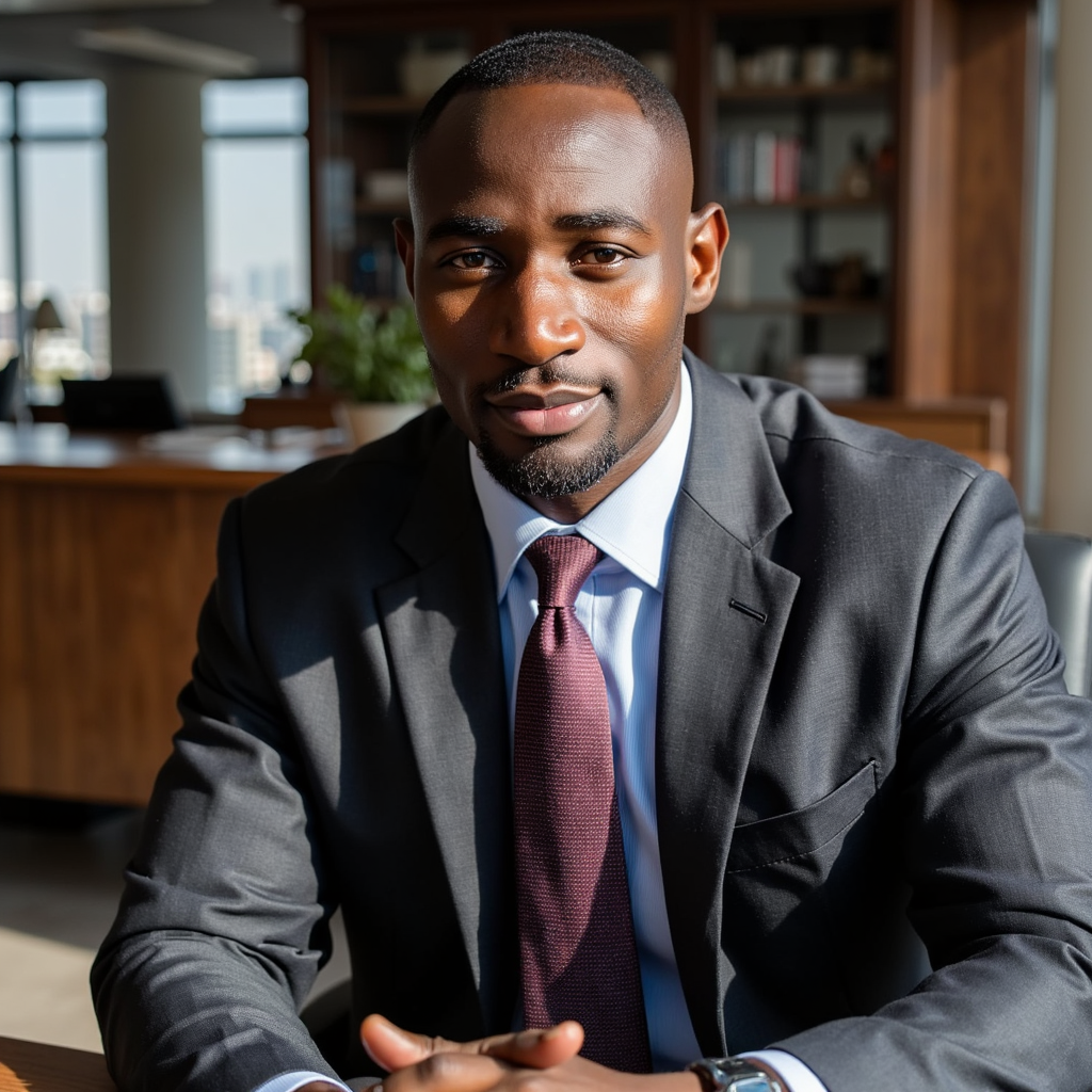 Three-quarter seated shot, 35 mm f/2.4. Man in late 40s, medium brown skin, short fade haircut with sharp edges. Charcoal slim-fit suit, light blue Oxford shirt, patterned navy tie. Leaning slightly forward with clasped hands. Lighting: daylight streaming through glass walls with slight rim on hair. Background: blurred skyline, clean glass surfaces, no paper clutter.