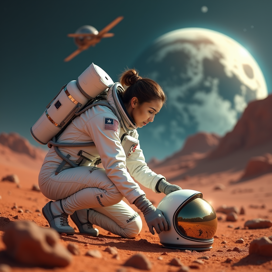 woman in white astronaut suit with utility pockets and metallic accents, no helmet, bending over to tinker with spaceship, surrounded by Martian terrain with craters, rocks, distant parked spaceship, under starry night sky with Mars, Jupiter visible, soft moonlight glow, subtle shadows on suit's textured fabric, intense focus on determined face, against warm rust-red Martian landscape.