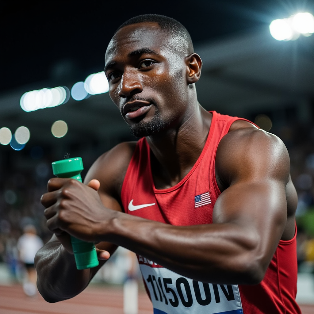 Headshot of a relay runner gripping a baton mid-hand-off, intense focus, motion blur behind, sharp side lighting — energy of World Athletics Championship captured