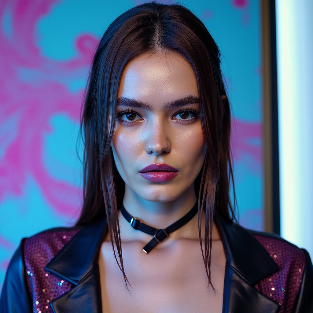 woman in an avant-garde ensemble, her slicked-back, wet-look hair framing a face adorned with sharp cat-eye eyeliner and metallic purple lipstick, glossy reflections dancing on her lips. She stands against a backdrop of swirling neon magenta and electric blue, bathed in harsh side lighting that sculpts dramatic shadows across her cheekbones, highlighting the hyperreal texture of her skin in this ultra-realistic…